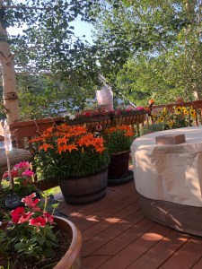 Yes, the front deck garden has been really beautiful, this year. Short-lived, with a snowstorm falling the first week of June, yet really beautiful. As the “time for summer” is growing painfully short, I ask myself why I am perceriving the time as being both very tedious and simultaneously frustratingly short since June 22. I think I have decided that it is for the same reason that the Fourth of July felt like any other day of the year, only with a proliferation of red, white and blue decor.